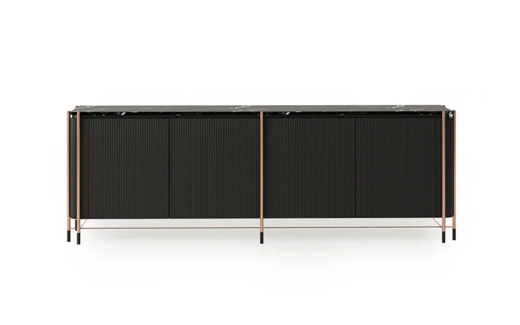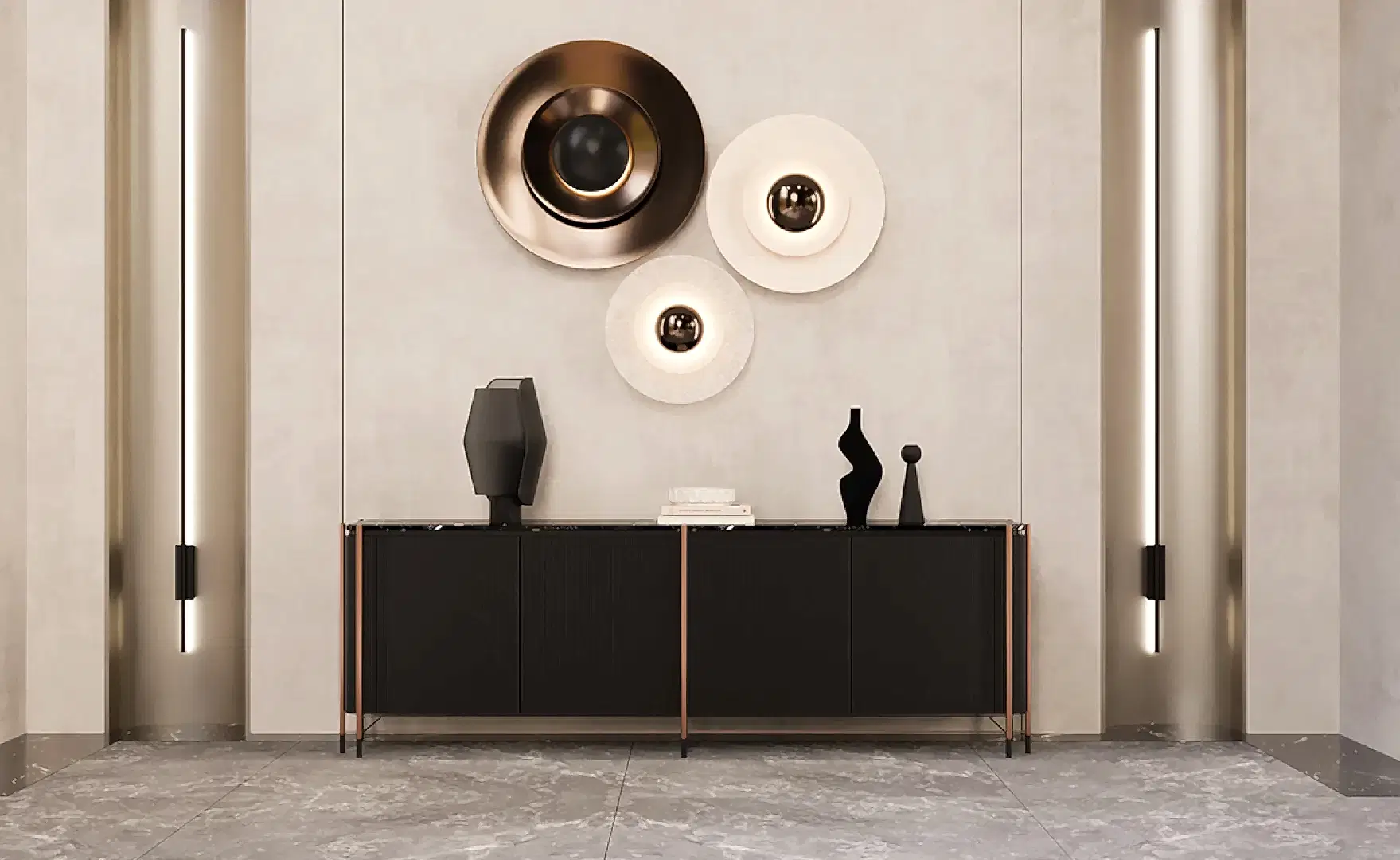 Siyahın cesur dokunuşu, mermerin karakteristik dokusu ile güçlenirken, bu etkileyici birlikteliğe etkileyici detaylar eşlik ediyor.