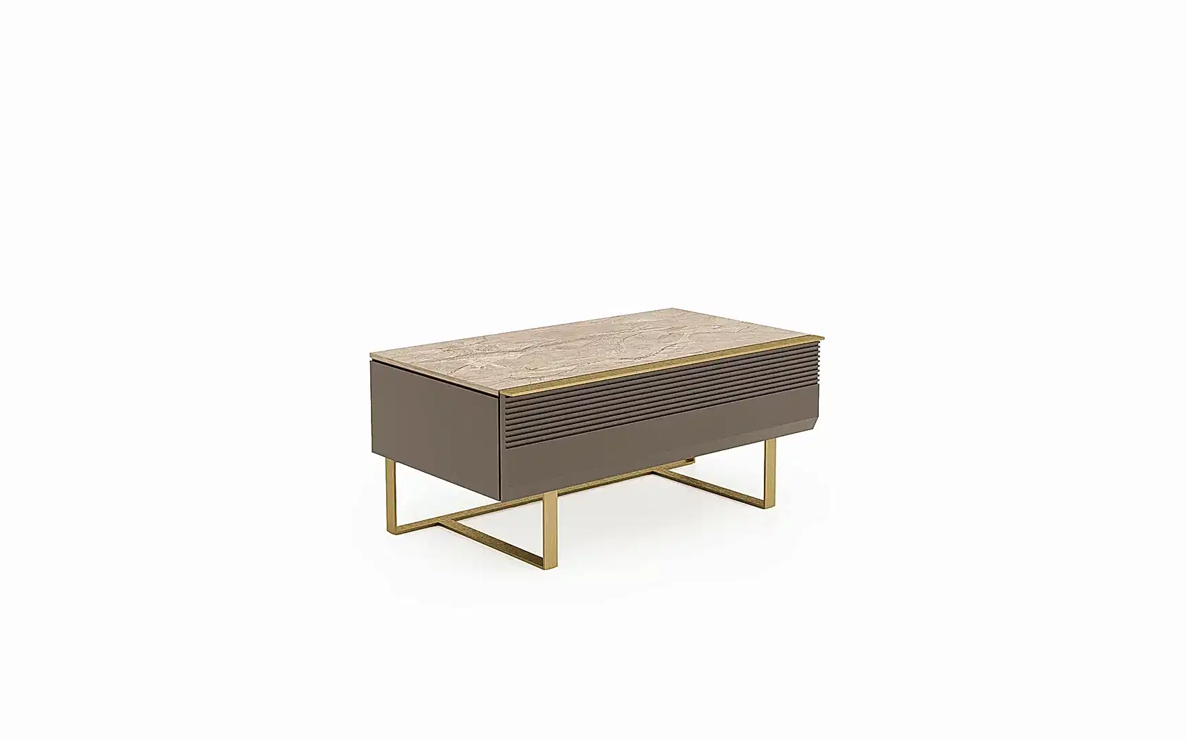 Doğal dokuların sıcaklığı, metal detayların modern çizgisiyle buluşuyor. Led aydınlatmalı cam raf, yumuşak bir ambiyans ışığı sağlarken tasarıma sofistike bir dokunuş katıyor. Porselen üst yüzeyi ve karakteristik formuyla Domo, yaşam alanınıza seçkin bir duruş kazandırıyor.