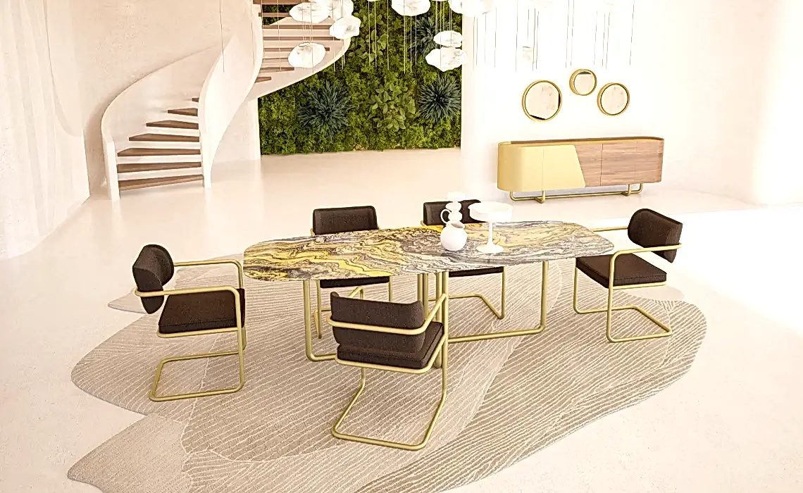 Altın renginin göz alıcı ihtişamı ve mermerin güçlü enerjisinden doğan bir tasarım Giallo Yemek Masası