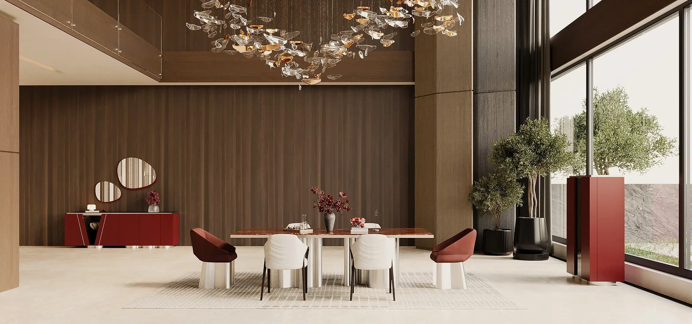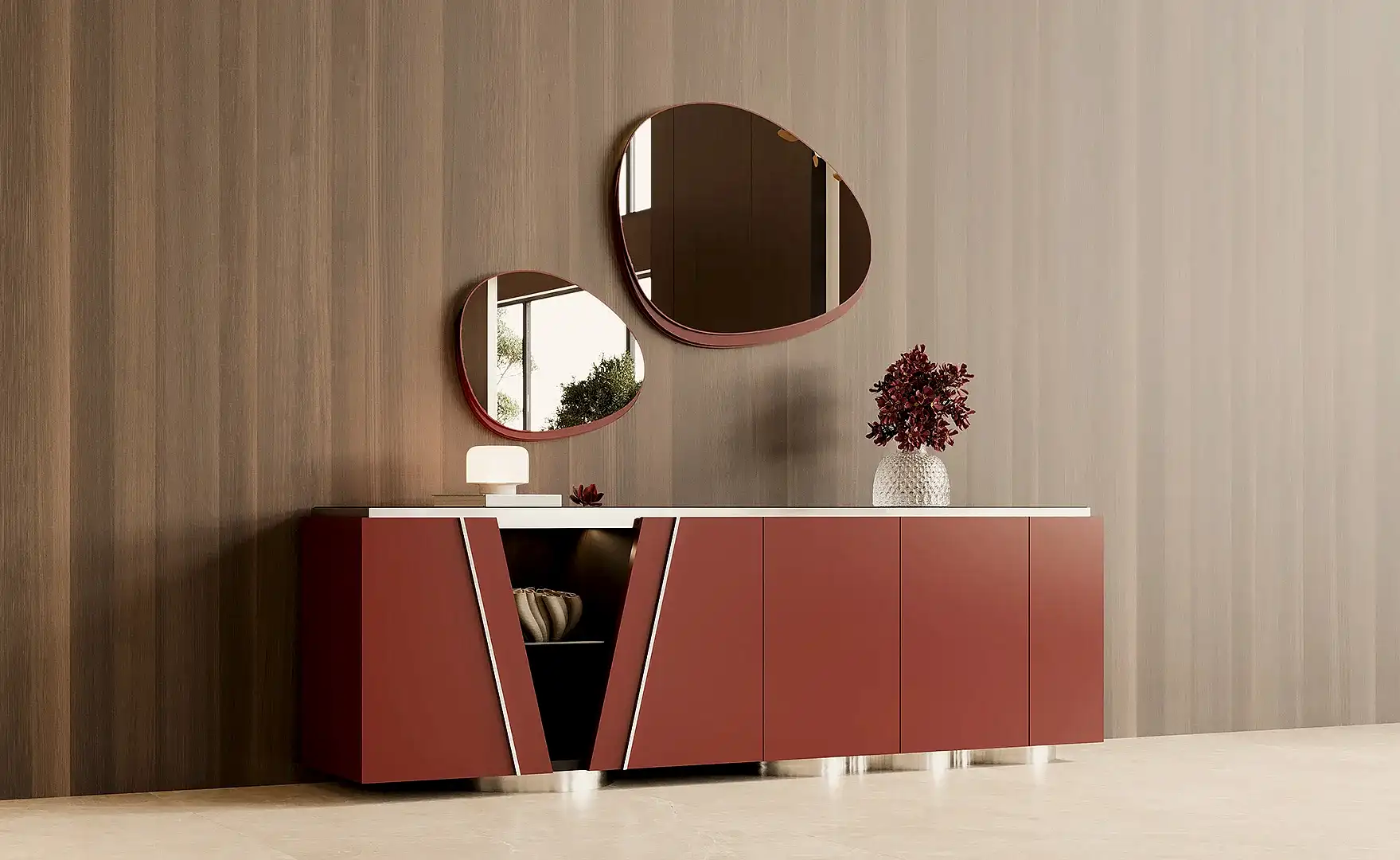 Granata Konsol, keskin geometrisi ve derin renk vurgularıyla mekânda güçlü bir odak noktası yaratıyor.